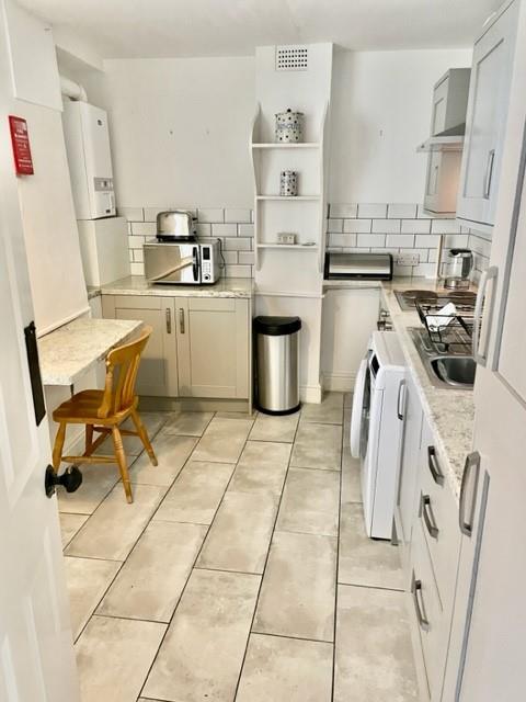Kitchen - modern fitted grey wooden units, with worktop over, washing machine/dryer , fridge with ice box, hob and oven with extractor over, plenty of storage and a breakfast table with stools. Fire blanket. Wipe clean tiled flooring.