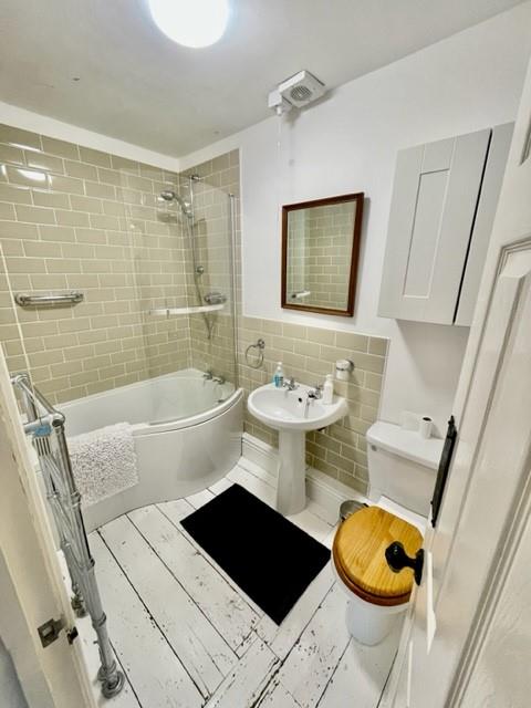 A good sized family bathroom - shower over a bath, basin, toilet, wipe clean flooring, medicine cupboard. Toilet roll holder.