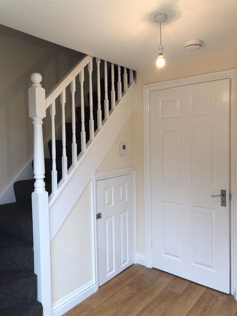 Entrance with stairs to the first floor, cupboard for storage and cloak room.