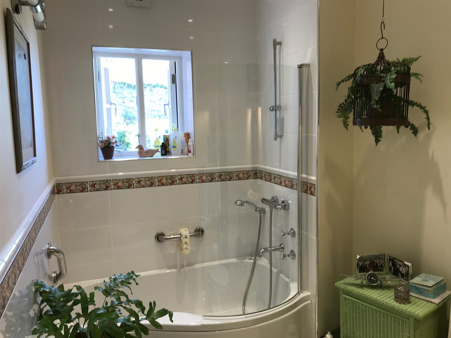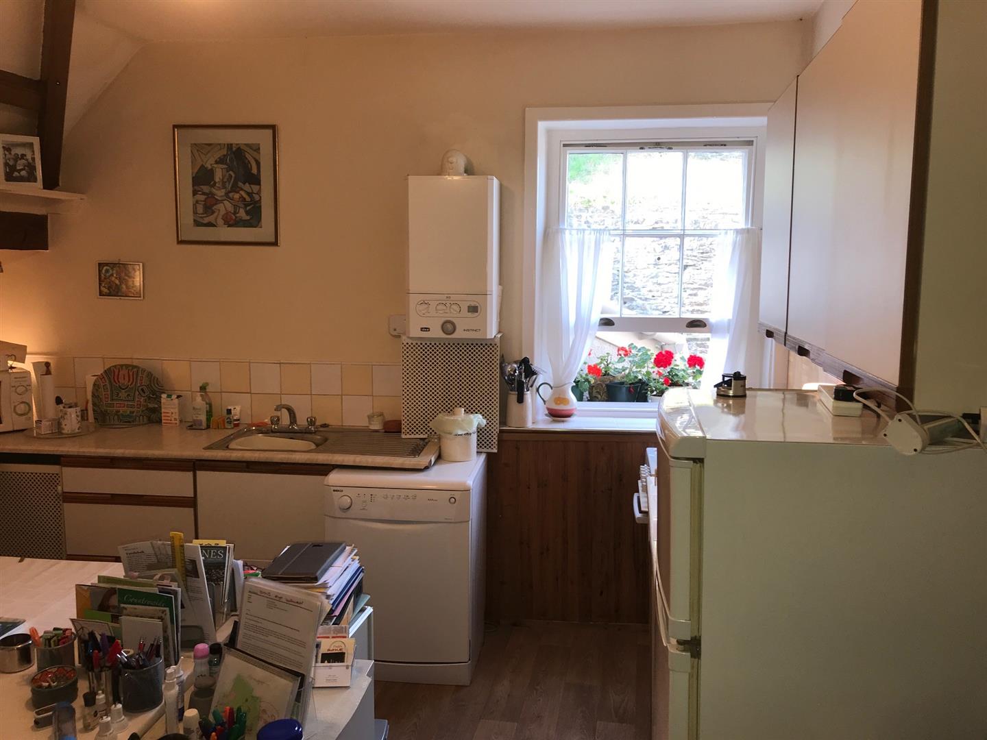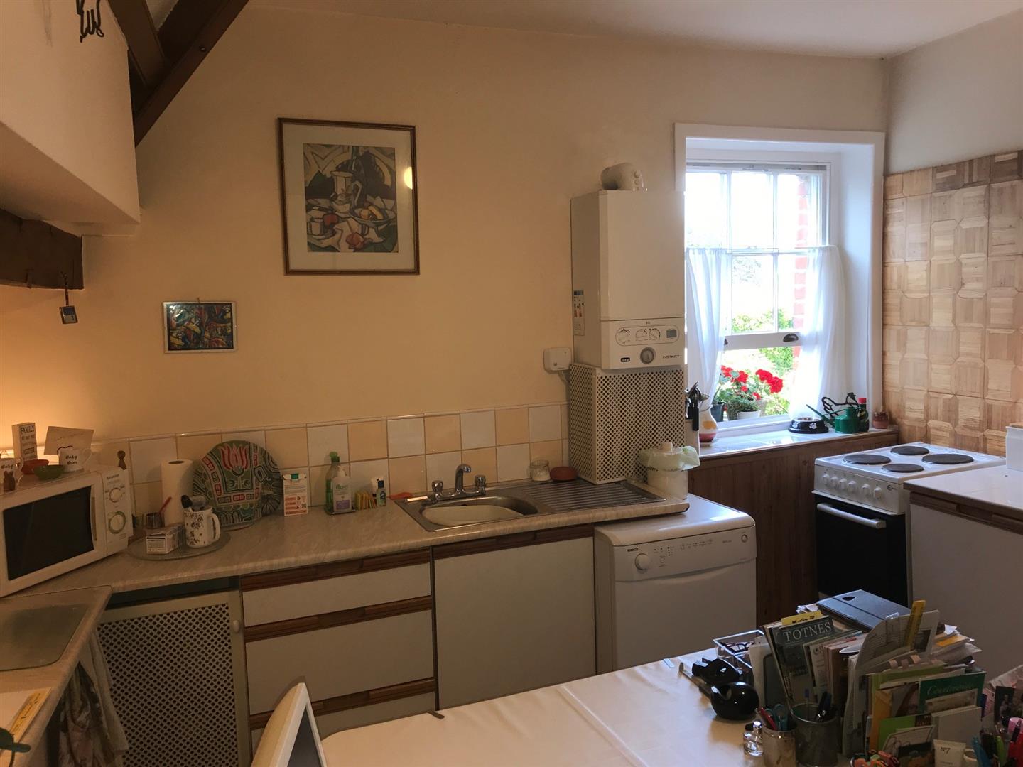 Kitchen/Dining Room 14' x 13'4" (4.27m x 4.06m) - Extensive range of fitted wall and base cupboard units, single bowl stainless steel sink. Ample work surfaces, space/plumbing for washing machine or dishwasher and space for fridge/freezer and electric cooker. Sash window to rear with outlook over Totnes Castle and Courtyard. Door to pantry/utility cupboard. Wooden ceiling beams. Oak effect vinyl flooring.